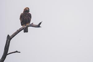 A lone raptor stands sentinel over the forest, its keen eyes scanning the horizon. Stillness, strength, and silence — captured in one frame.
