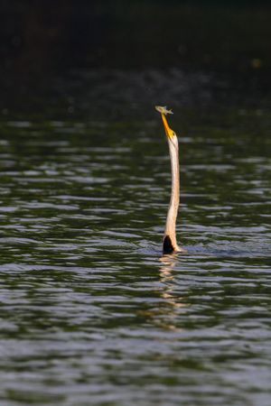 A snakebird stands motionless in open water, perfectly balanced between reflection and stillness. Captured in natural habitat, this image highlights the quiet waiting instinct of wetland hunters – a moment of pure calm before sudden movement. A minimal composition for collectors who appreciate silence, patience and form in nature.