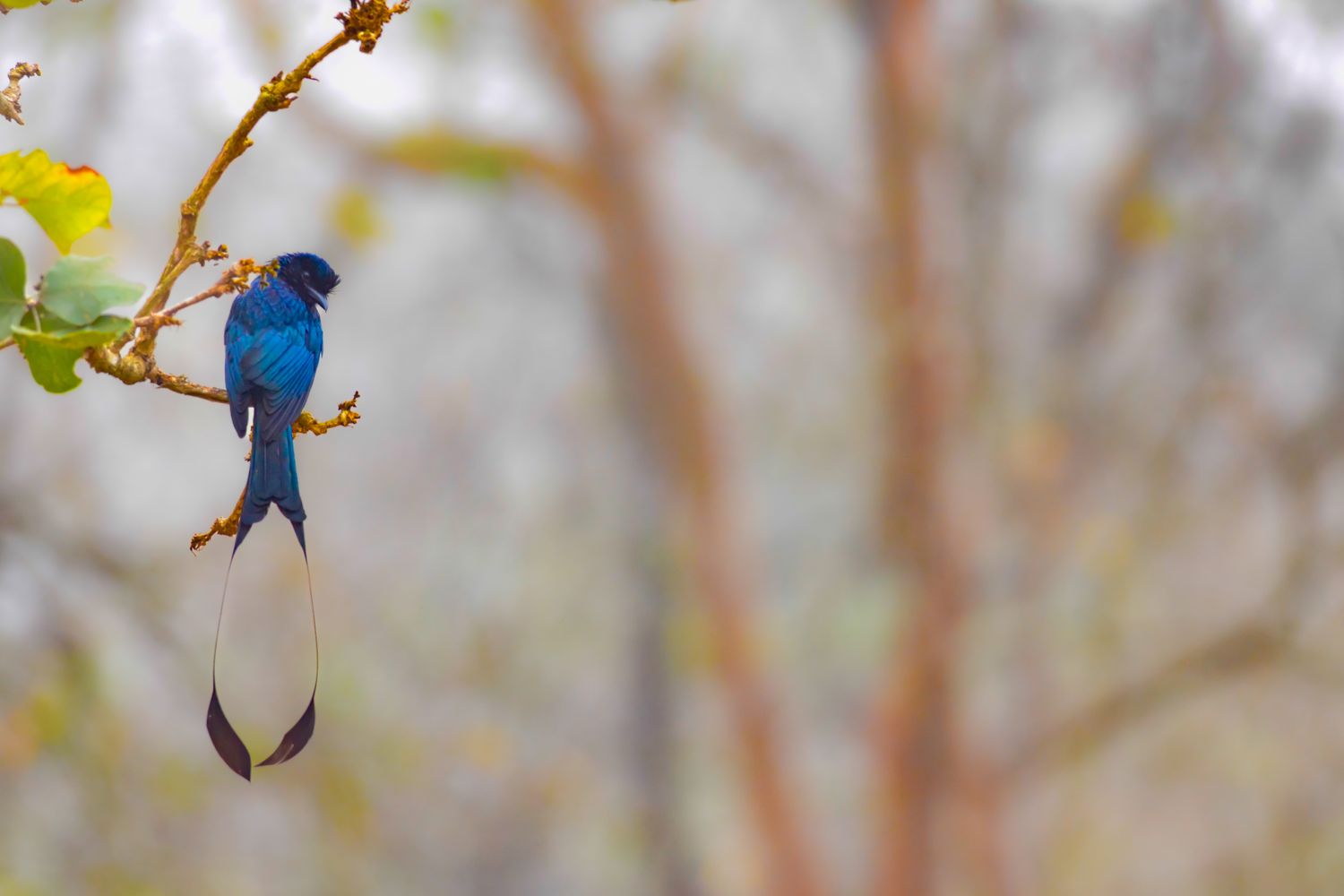 A male Asian Paradise Flycatcher perched quietly inside a dense forest canopy. Known for its striking cobalt-blue body and long ribbon-like tail streamers, this migratory species is admired for its elegance and graceful movement. Photograph made in natural ambient light, within native woodland habitat. This artwork celebrates both rare beauty and the delicate balance of wild ecosystems — a quiet moment preserved, as seen in nature without interference.