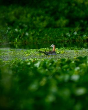 A Pheasant-tailed Jacana glides across floating vegetation inside a freshwater wetland. The dense green environment and selective depth of field create a soft, painterly look — highlighting the bird’s elegant breeding plumage and extended tail feathers. This photograph documents a quiet, undisturbed moment in nature, captured in natural light within its native habitat.