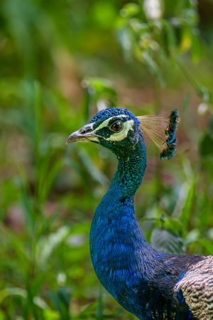 A male peacock stands alert within the forest undergrowth, its iridescent blue-green plumage catching the soft light. The close profile highlights the intricate patterns, colours, and crest feathers that make the species one of India’s most iconic birds. Photographed inside Sariska Tiger Reserve.