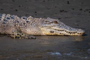 A saltwater crocodile rests motionless along the muddy riverbank, its heavy scales catching subtle light and texture. In this moment of complete stillness, the powerful predator merges almost seamlessly with the landscape—silent, patient, and entirely in control of its territory. Photographed in the wild, this frame captures the primal tension between calm and lethal strength that defines apex reptiles in these ecosystems.